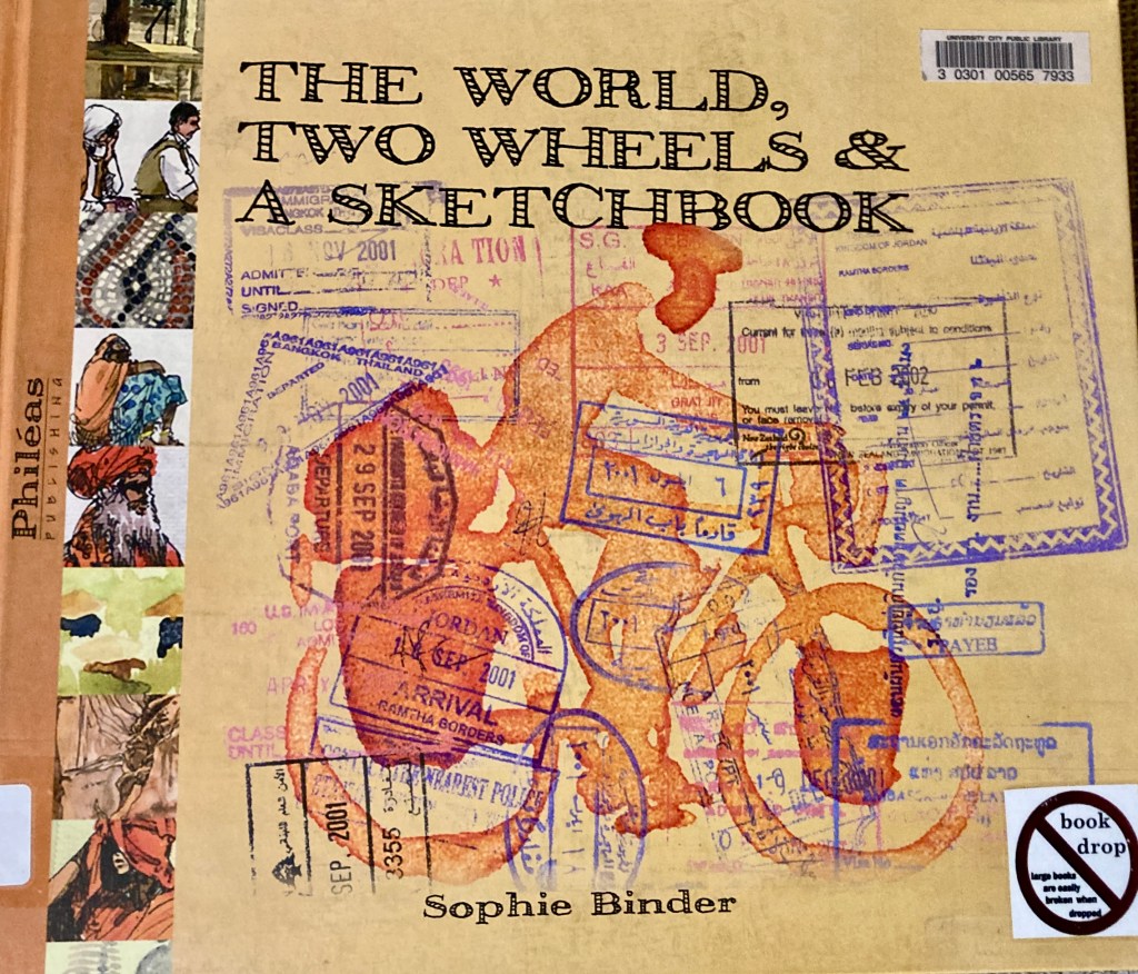 My second non-recommendation is The World, Two Wheels and a Sketchbook. The author and artist is Sophie Binder. It was published in 2013. Linda Ballard, the retired Director of the University City library, pressed this book on me. And I am grateful, even though the illustrated travel journal weighs almost six pounds, not exactly airplane reading.