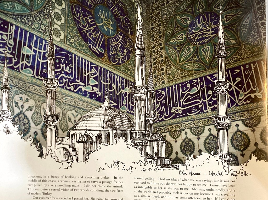 All told, she traveled over 14,000 miles in 14 months. The biking part was strenuous. But to have time and the mental bandwidth to journal, draw, and paint boggles my mind. She coaxed beautiful, rich colors from a travel water-color set. Pen and ink as well. In the final product, each page is an artful master lesson on how to lay out combinations of type, handwriting, paintings and photos.