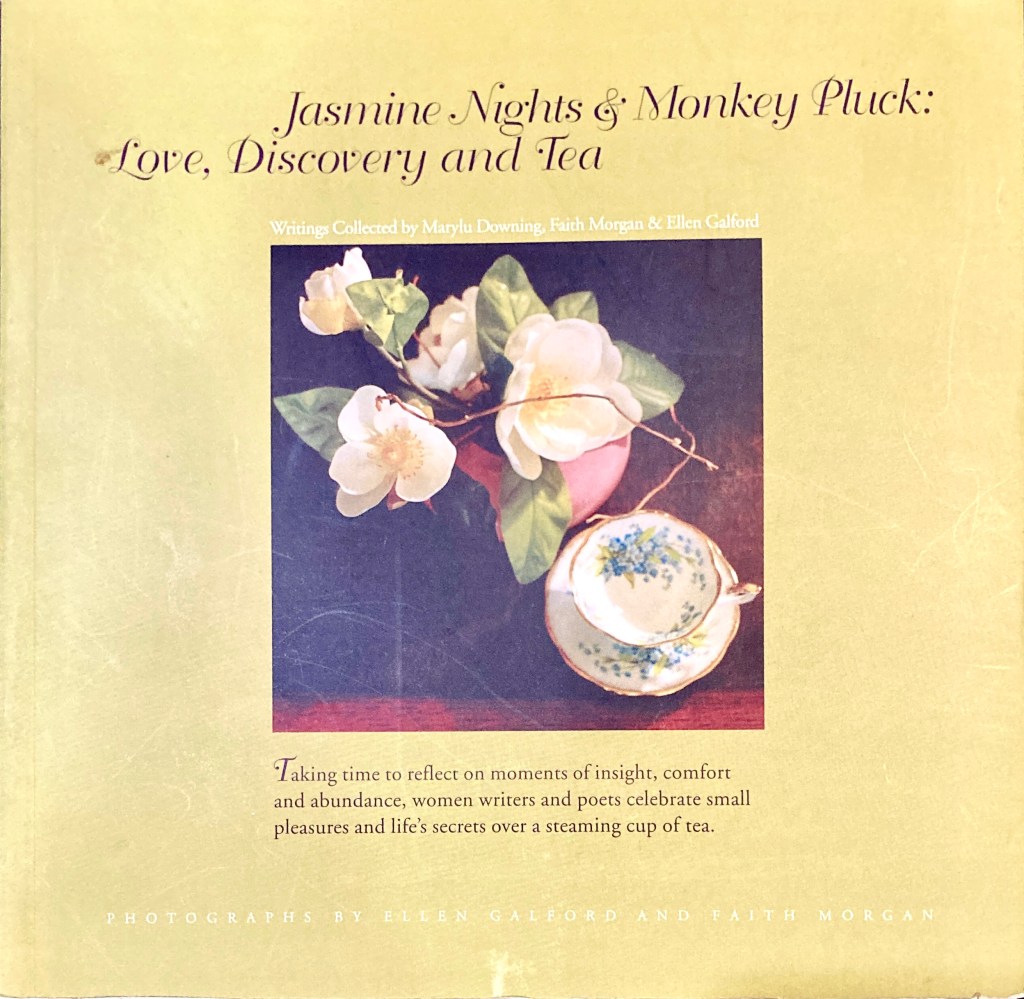My next non-recommendation is Jasmine Nights & Monkey Pluck: Love, Discovery and Tea by Marylu Downing, Faith Morgan, and Ellen Galford, published in 2002. In this slim volume, women authors meditate on the everyday and the extraordinary events of life through the lens of tea. Each essay or poem is short enough to fit on one page. On the opposite page is a glorious picture of tea-ware.